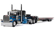 Peterbilt Model 389 with 48” Flat Top Sleeper in Blue and Black Hauling Landoll 440B-50CA Traveling Axle Trailer... |
